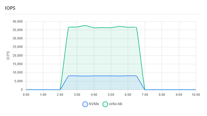 最近在测试我们的VM时,发现了一个比较奇怪的现象:对于同样的一个IO压力,当IO设备是NVMe或者virtio-blk时,行为有一些不太一样,具体表现在IOPS上,而且差距非常大,同样是1GB/s左右的IO,两个不同设备的IOPS差了接近4倍: